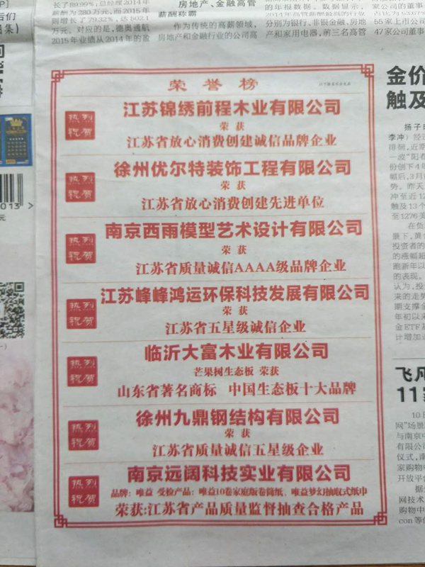 優(yōu)爾特裝飾被江蘇省放心消協(xié)創(chuàng)建辦認(rèn)定為放心消費(fèi)先進(jìn)單位