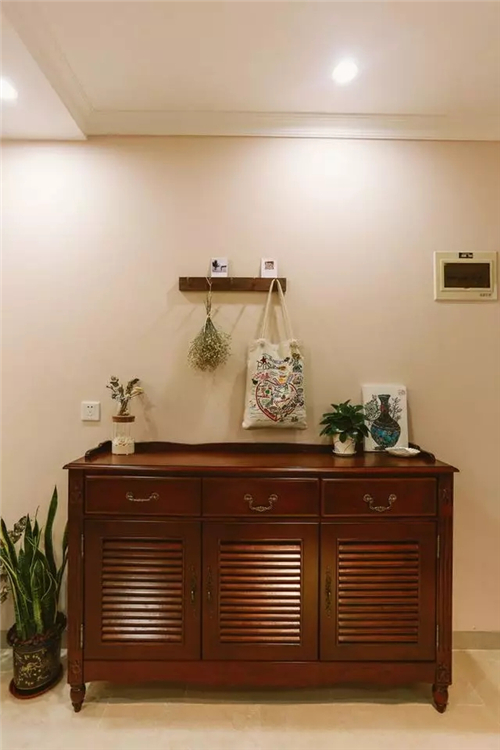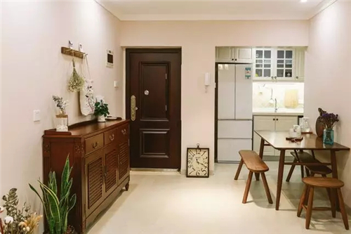 門口的櫥柜是木質(zhì)的,與餐桌椅的風(fēng)格比較搭。餐桌比較簡單,太大的話會顯得空間比較擁擠。